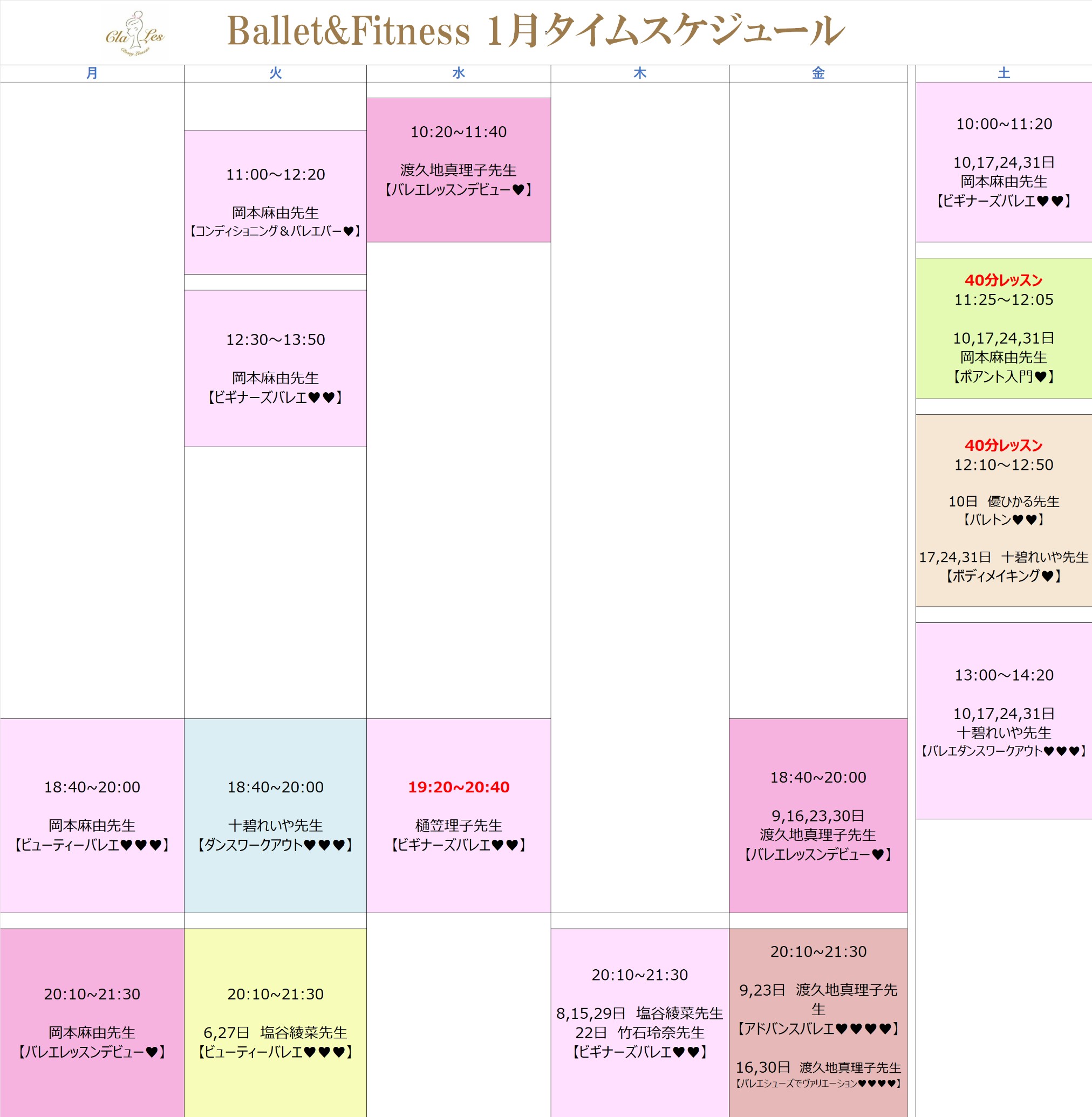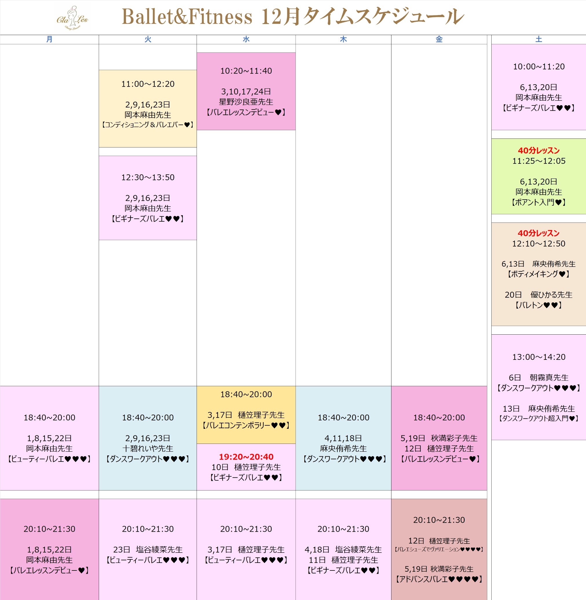 HOMEスケジュール スケジュール Schedule ※スケジュール・講師は変更になる可能性があります。2025.11,3(月)現在 体験レッスン予約をご希望の方は、「体験レッスン予約」へ 会員のご予約はこちらから「予約システム」 ※スケジュール・講師は変更になる可能性があります。2025.12,1(月)現在 冬季休業のお知らせ ・2025年12月24日(水)午後∼2026年1月4日(日)終日 体験レッスン予約をご希望の方は、「体験レッスン予約」へ 会員のご予約はこちらから「予約システム」